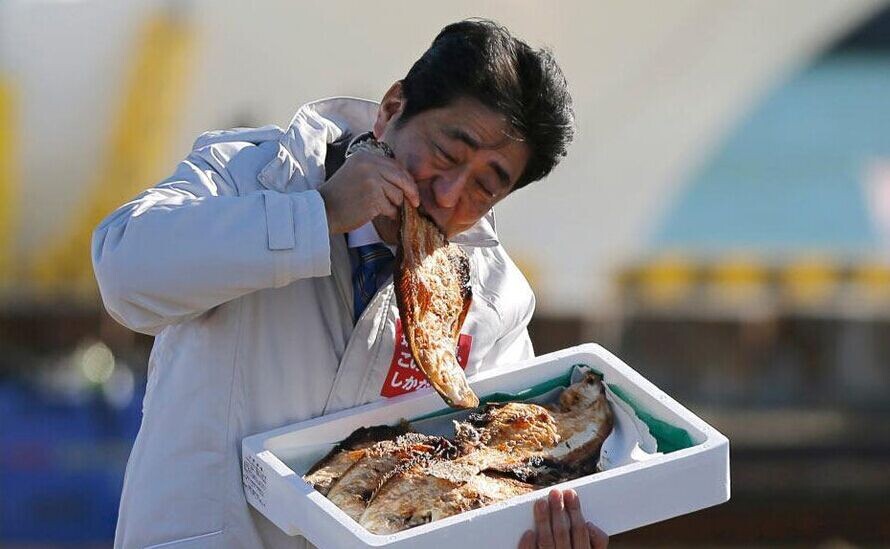 当地时间2014年12月2日,日本福岛索玛,日本众议院选举官方竞选活动启动,首相安倍晋三为自民党造势。日本众议院选举将在12月14日举行。为了讨好当地民众,安倍在活动现场品尝当地特色烤鱼,显示对农产品的支持。
